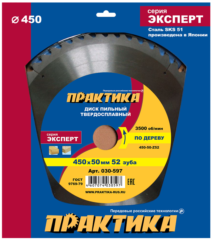 Диск пильный твердосплавный по дереву, ДСП ПРАКТИКА 450 х 50 мм, 52 зуба (030-597)