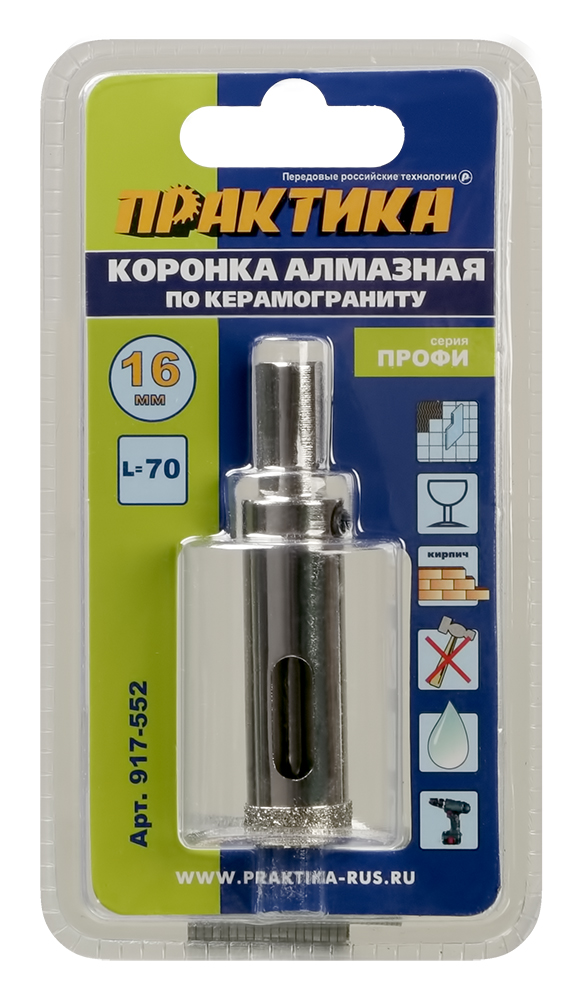 • Коронка алмазная ПРАКТИКА "Профи" по керамограниту/керамике  16х70мм, пилотное сверло (1шт) блистер (917-552)